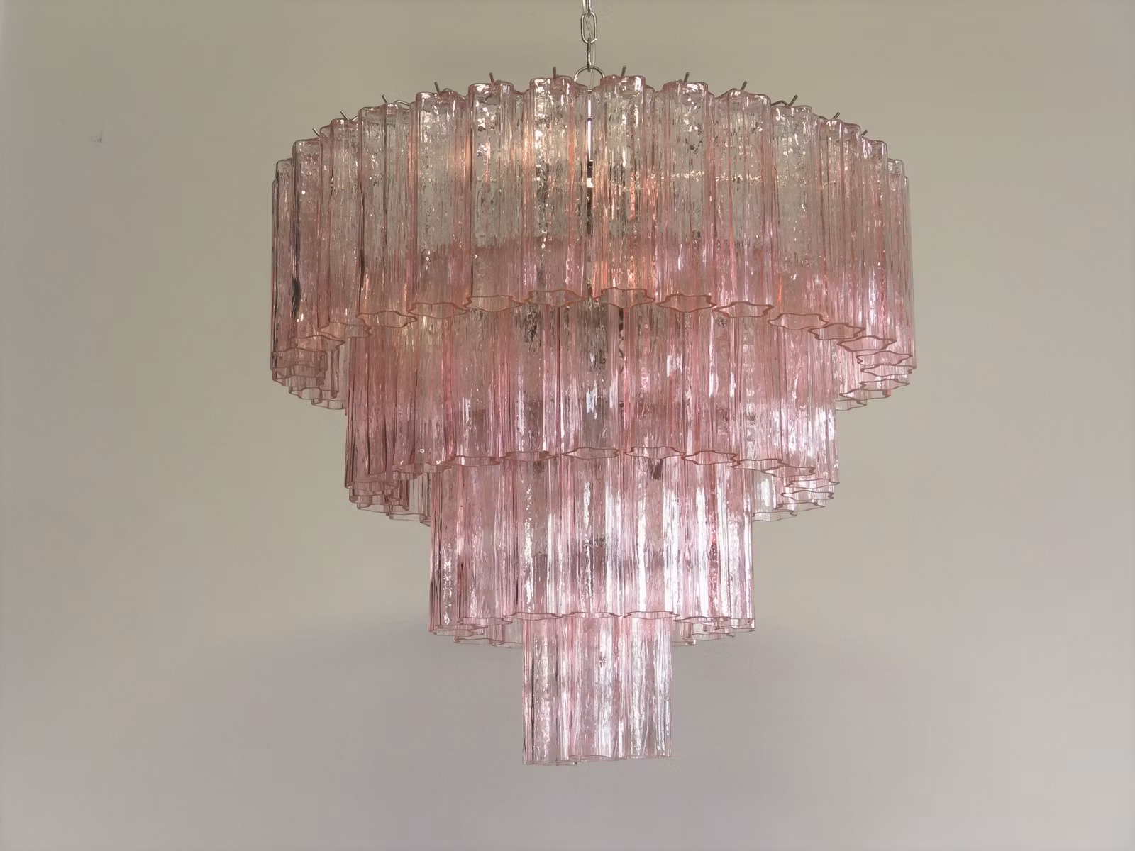 Italiensk ljuskrona i Murano glas, fyra våningar med 78 stora Albaster rosa glasrör i stjärnform.
