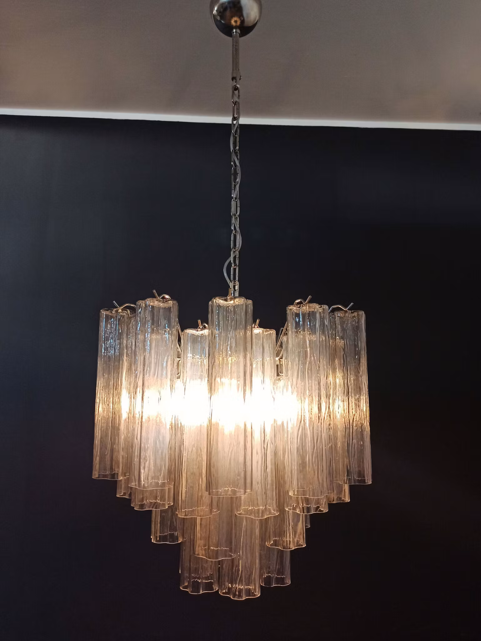 En elegant ljuskrona som kombinerar italiensk glastradition med modern design. De rörformade Murano-prismorna skapar ett fascinerande ljusspel och gör armaturen till en tidlös mittpunkt i hemmet.