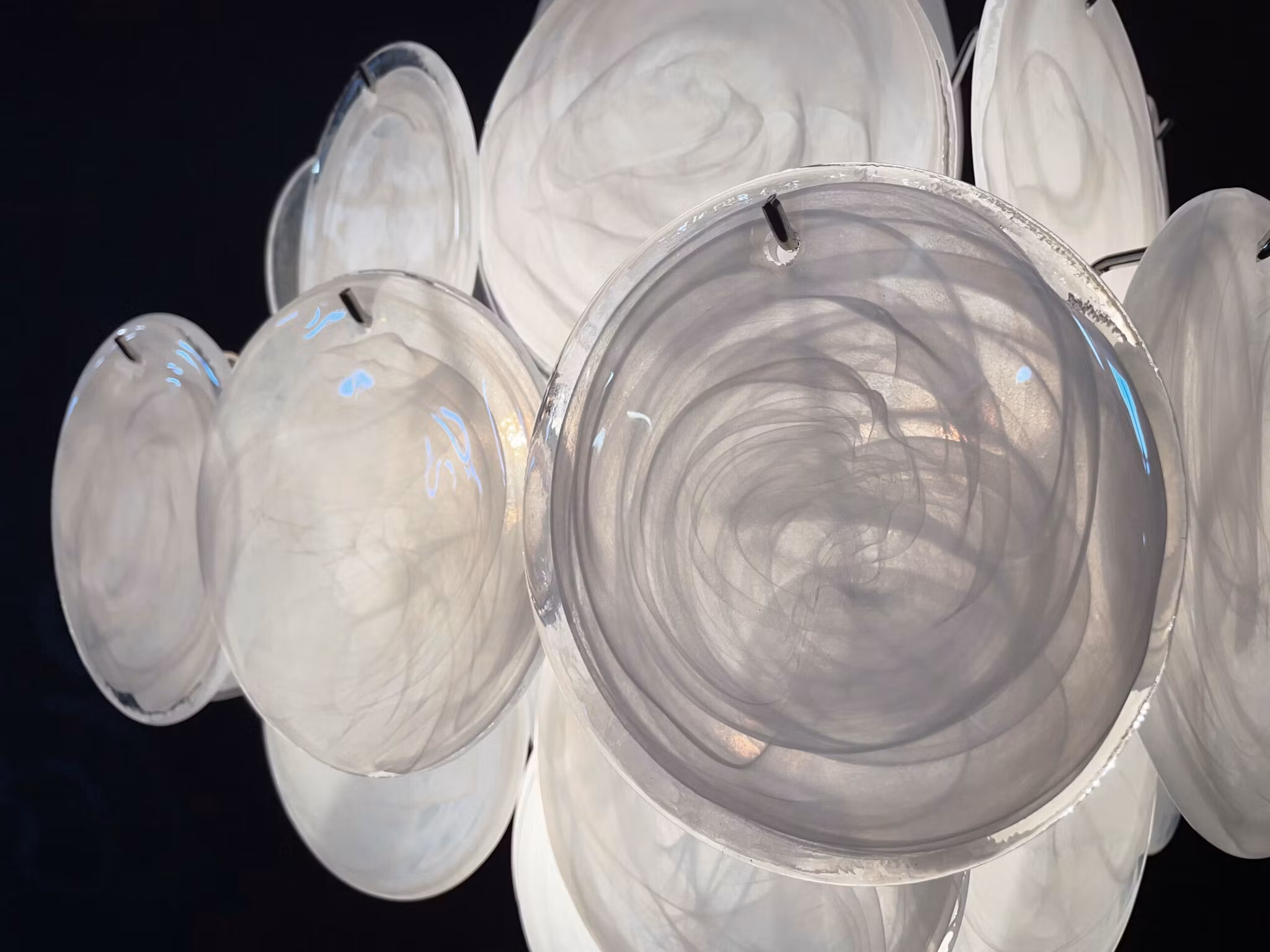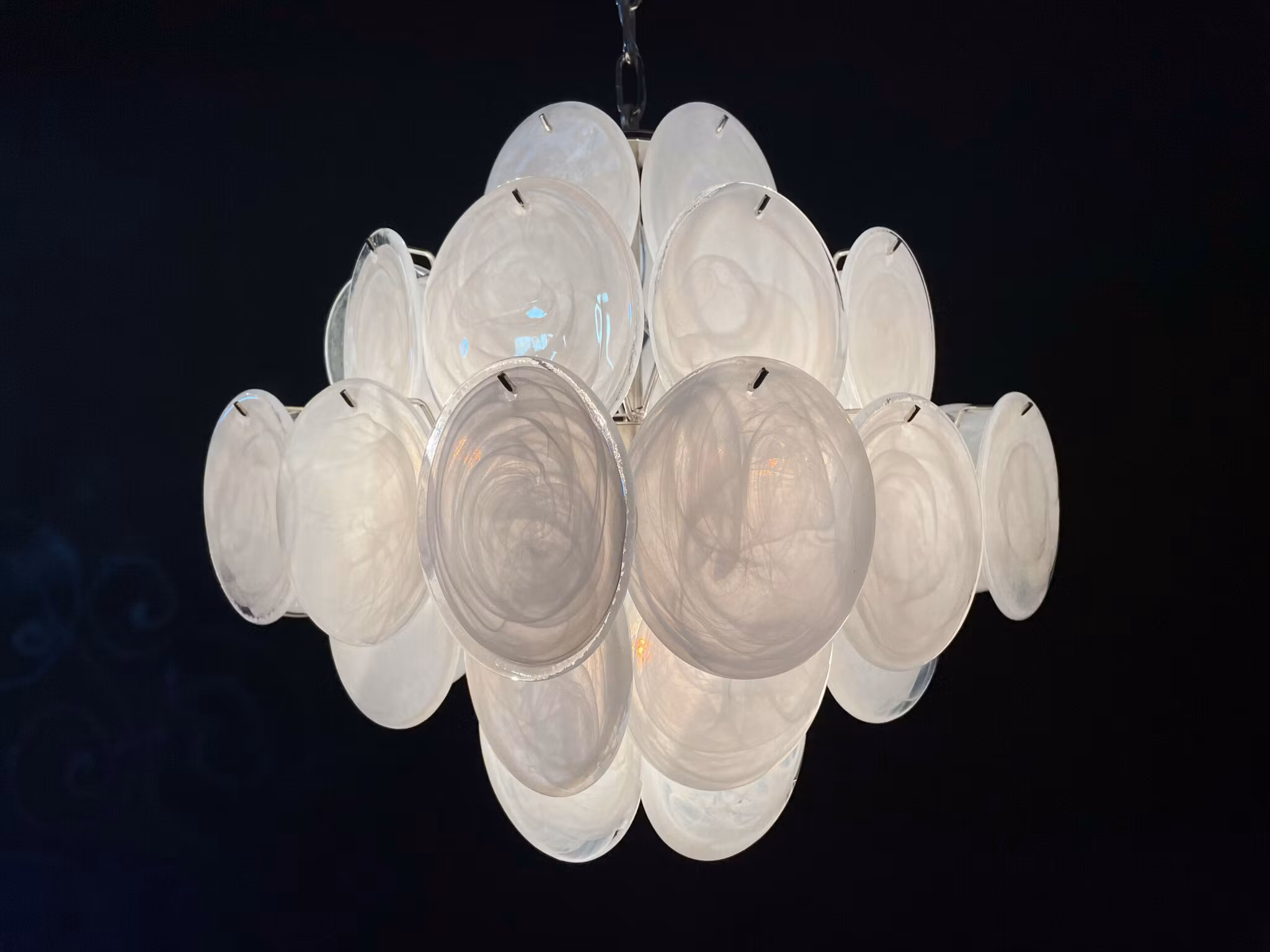 En elegant italiensk ljuskrona med 36 iriserande glasdiskar monterade på en kromad stomme. Den tidlösa designen sprider ett mjukt, skimrande ljus och blir ett stilfullt blickfång i varje rum.