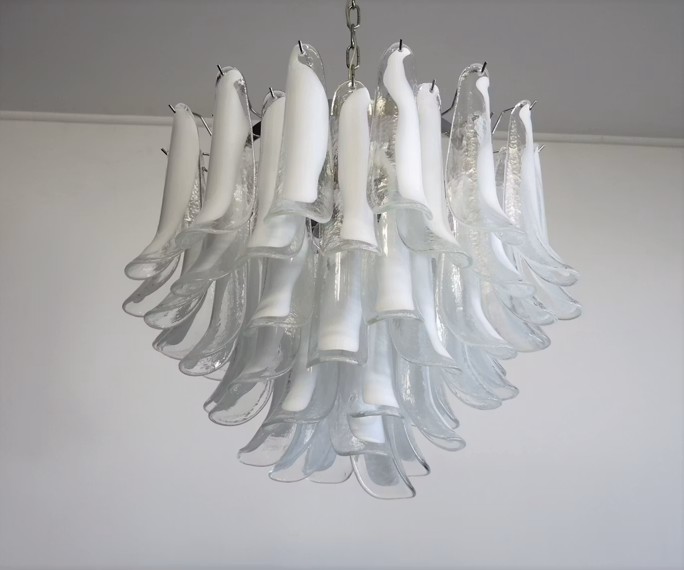 Fantastisk italiensk Murano-ljuskrona gjord med 53 stora och imponerande vita och klara kronblad på en förnicklad metallram. Glasbladen är handblåsta i Mazzega-stil och har ett fint abstrakt mönster i klart och vitfärgat glas. Detta skapar en varm och mjuk belysning