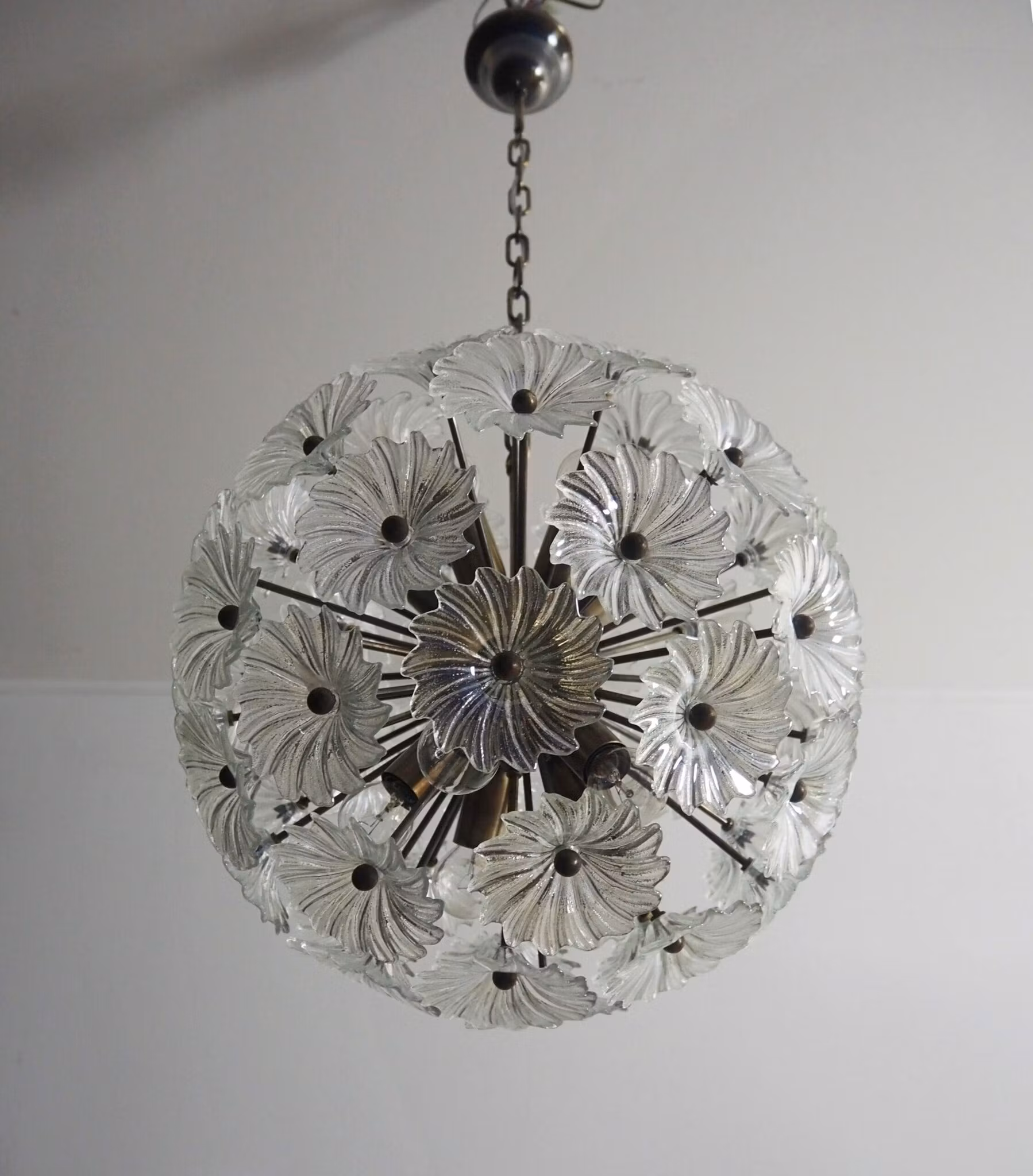 Sputnik, italiensk vintagekristallkrona från rymdåldern, tillverkad av 51 flerfärgade glas i en metall stomme. Elegant belysningsobjekt.