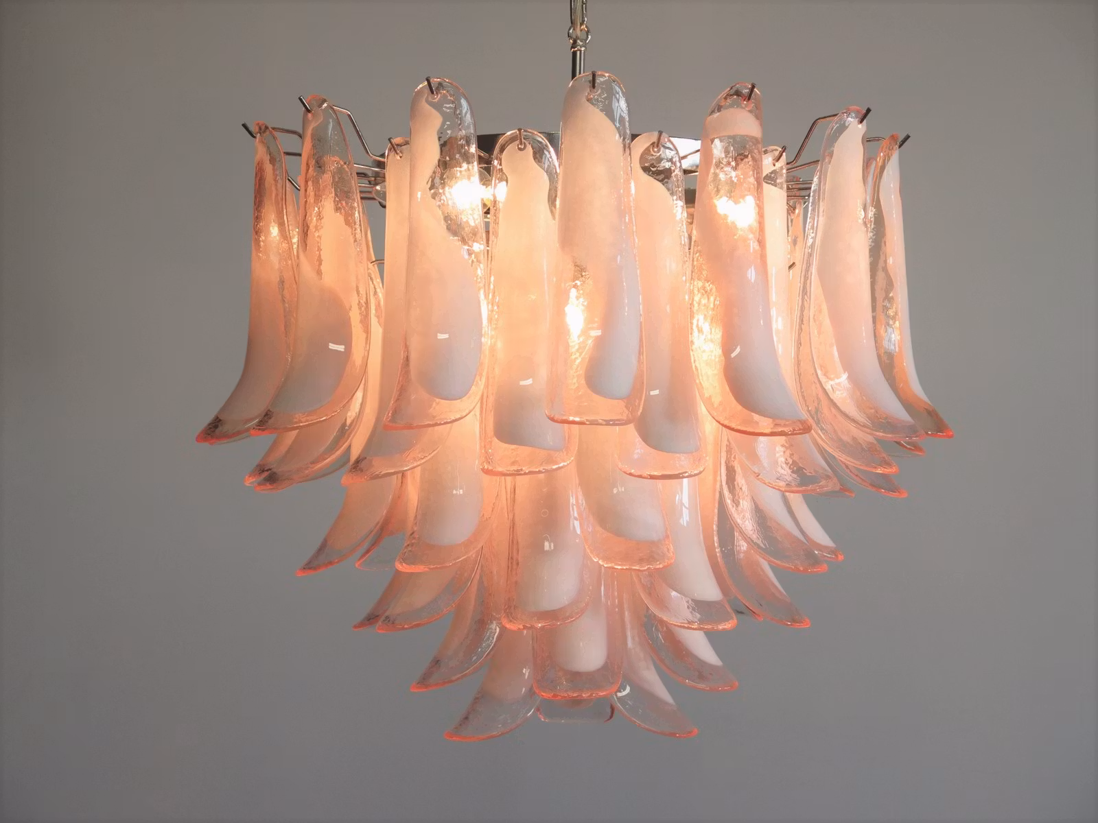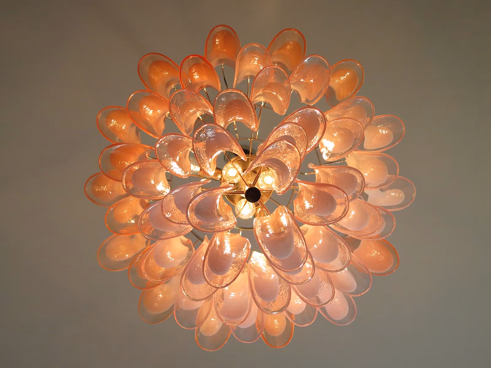 En exklusiv ljuskrona med 53 handgjorda rosa glasblad som tillför både ljus och konstnärlig skönhet till ditt hem. Den unika designen skapar en sofistikerad atmosfär och blir en tidlös mittpunkt i rummet.