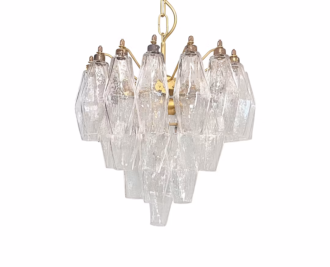 Ta med tidlös elegans och innovativ design i ditt utrymme med Murano Poliedri ljuskrona, ett mästerverk inspirerat av den legendariska arkitekten Carlo Scarpa.