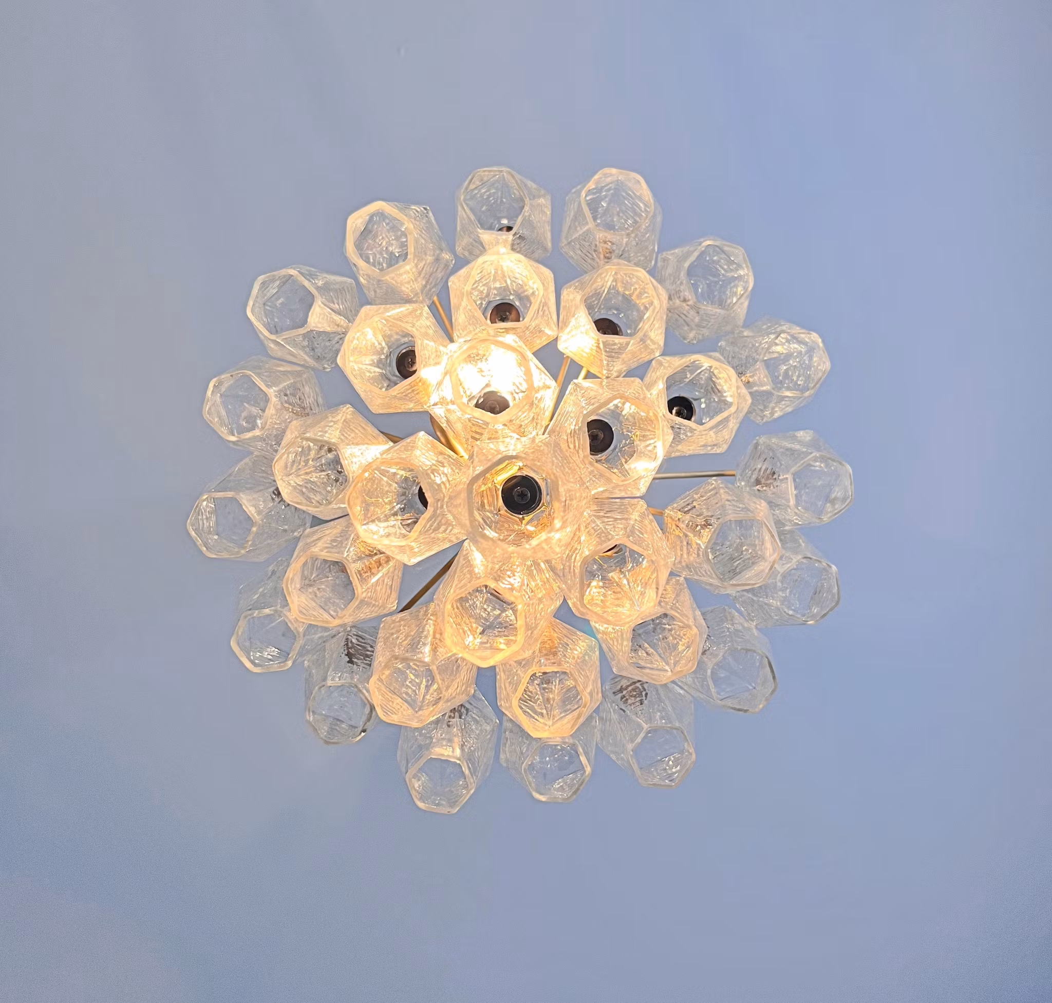 Tillverkad med utsökt 32 Murano-glas, har denna ljuskrona en fängslande samling av geometriska, facetterade glaselement som reflekterar och sprider ljus vackert, vilket skapar en fascinerande visuell effekt.