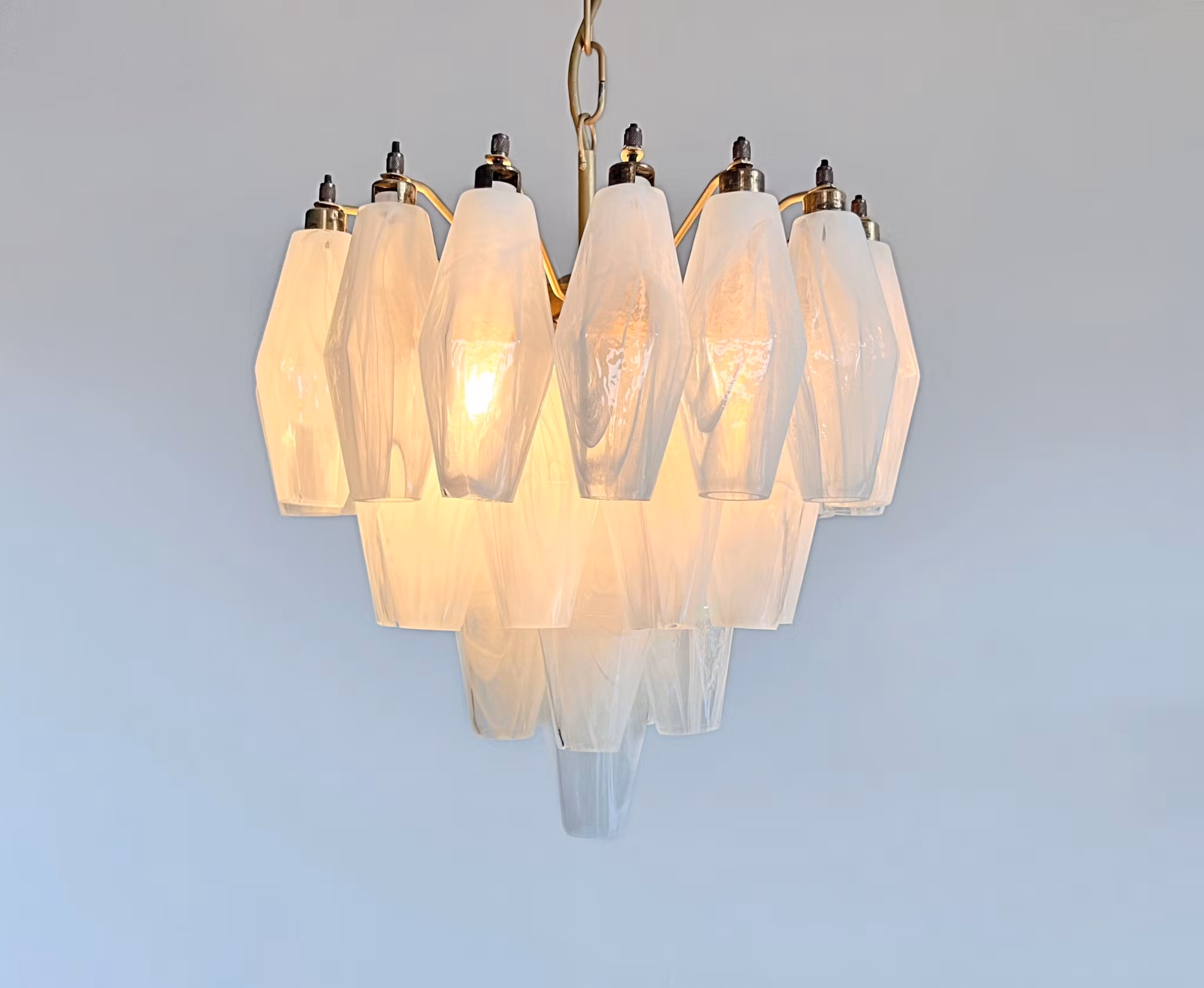 Tillverkad med utsökt 32 Murano-snövit glas, har denna ljuskrona en fängslande samling av geometriska, facetterade glaselement som reflekterar och sprider ljus vackert, vilket skapar en fascinerande visuell effekt.