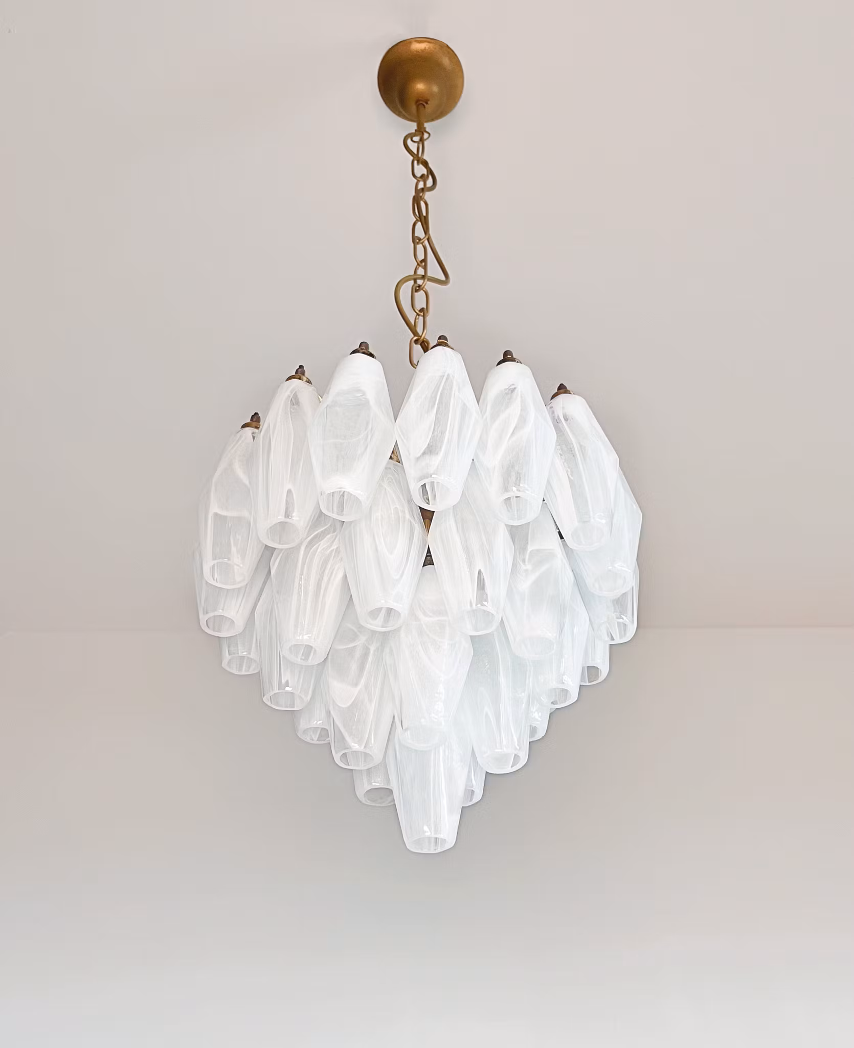 Ta med tidlös elegans och innovativ design i ditt utrymme med Murano Poliedri ljuskrona, ett mästerverk inspirerat av den legendariska arkitekten Carlo Scarpa.