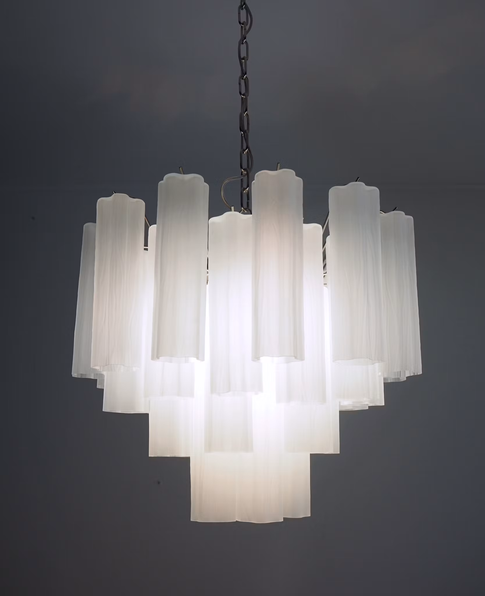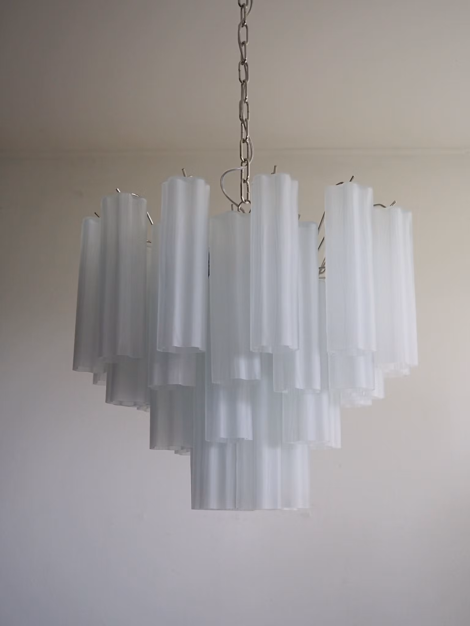 Italiensk ljuskrona Tube gjord av 36 vackra vita Murano med stjärnform. Helt otroligt vacker ljuskrona.