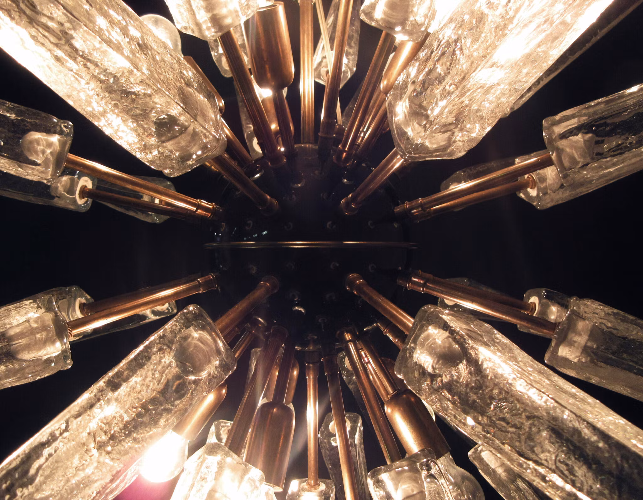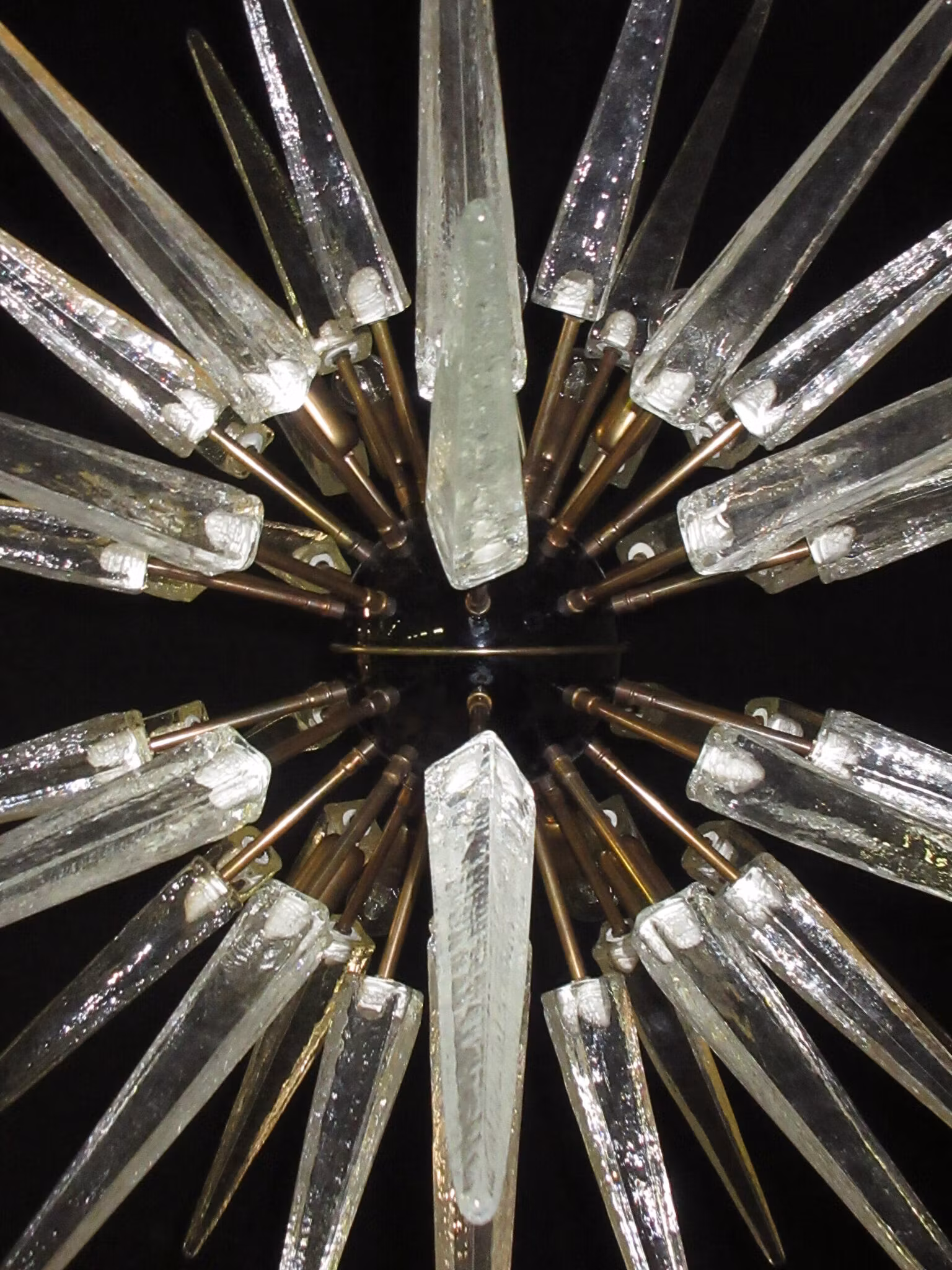 Italiensk sputnik krona i svart och mässings metall, 51 genomskinliga glasspetsar.10 ljuspunkter.