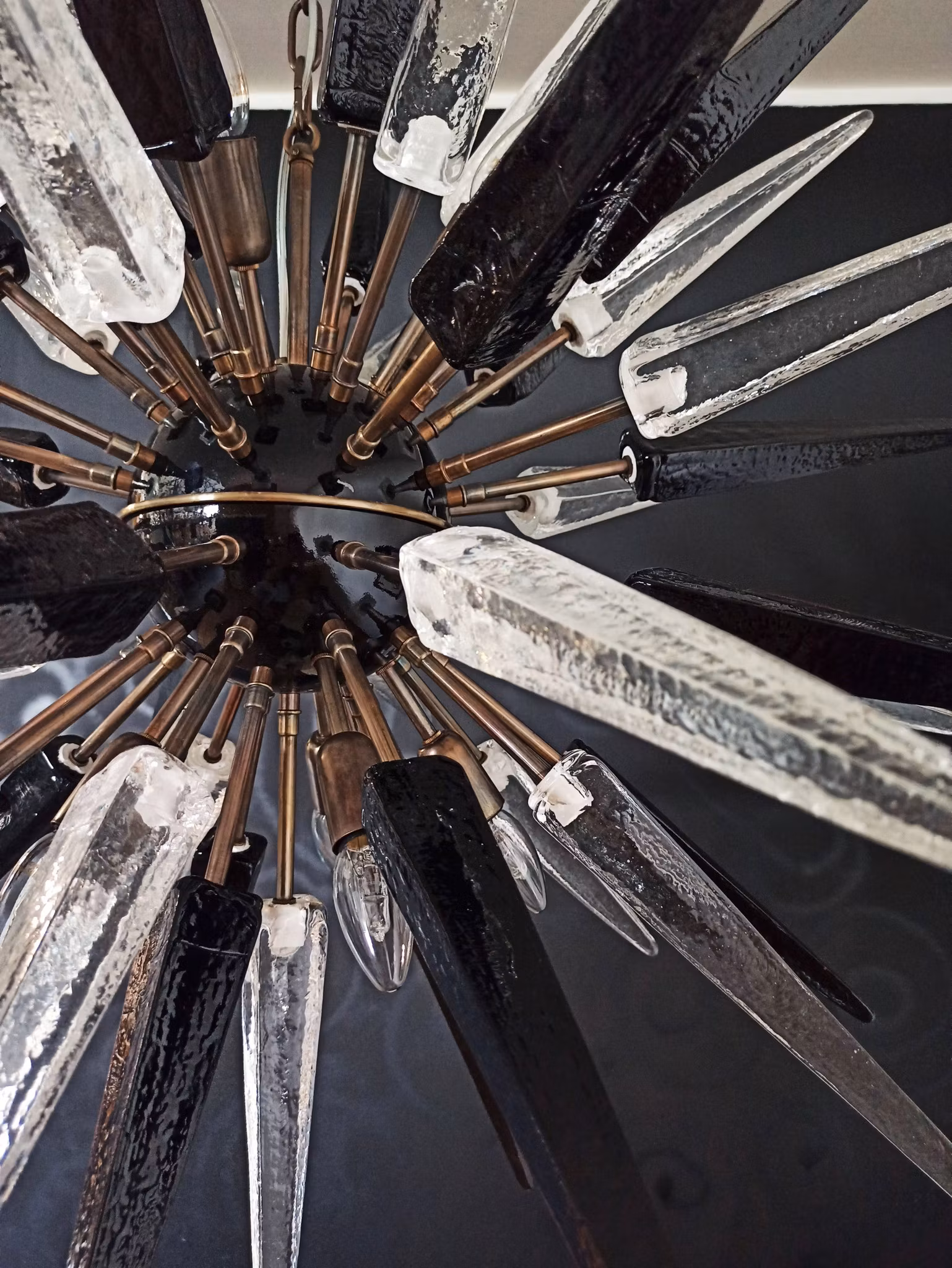 Italiensk Sputnik-ljuskrona i svart och mässingsmetall, med 51 unika transparenta och svarta glaspinnar. Murano-glas, traditionellt munblåst. 10 ljuspunkter.