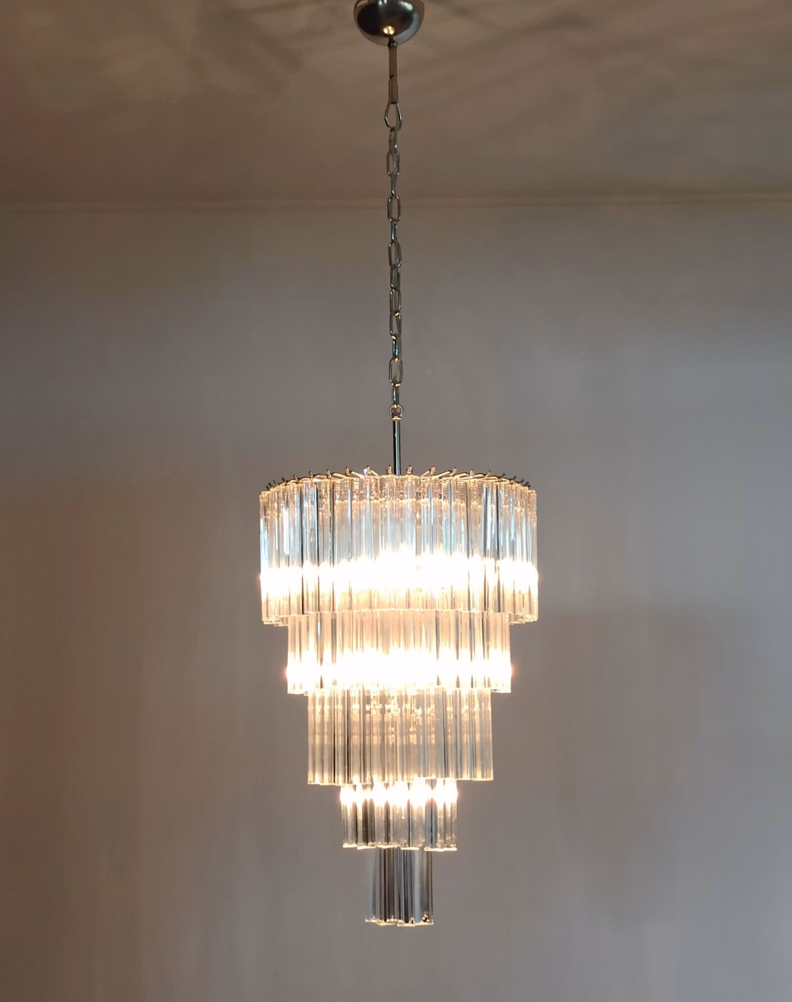 Låt ditt hem lysa med 111 handgjorda Triedri-kristallprismor, omsorgsfullt arrangerade på en solid krom. Denna Murano-ljuskrona kombinerar italiensk elegans med konstnärligt hantverk och blir både ett gnistrande ljusinslag och ett stilfullt blickfång i varje rum.