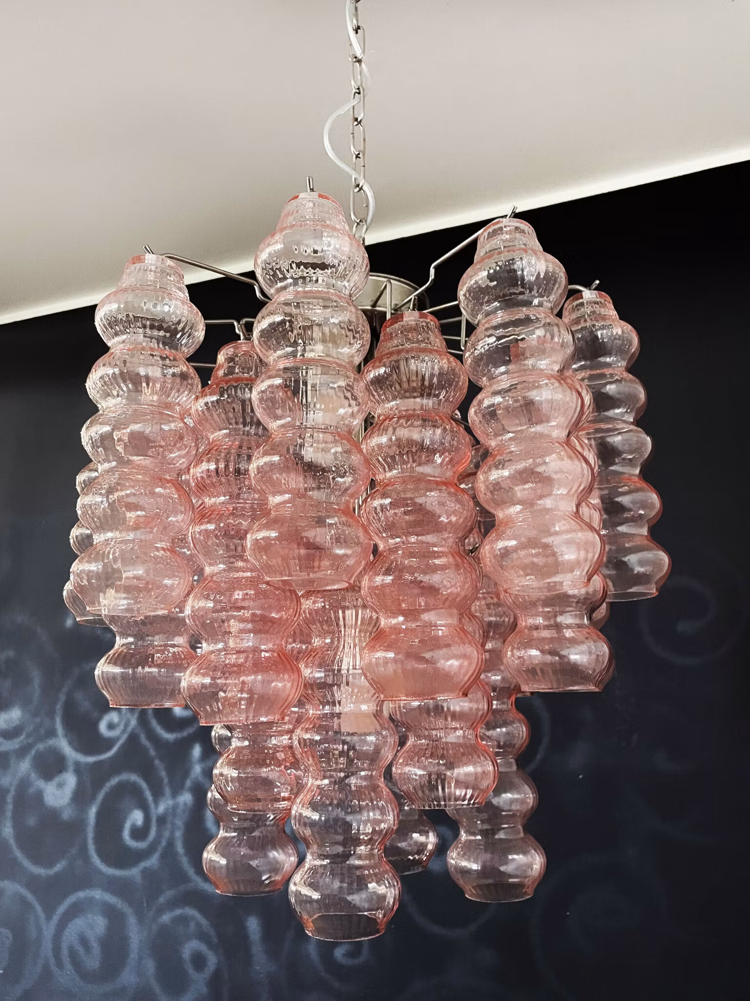 Vackert rosa Murano som är tillverkas på ett gammalt traditionellt italiensk sätt. Takkronan har 26 stora Tube glasrör. Metall stomme.
