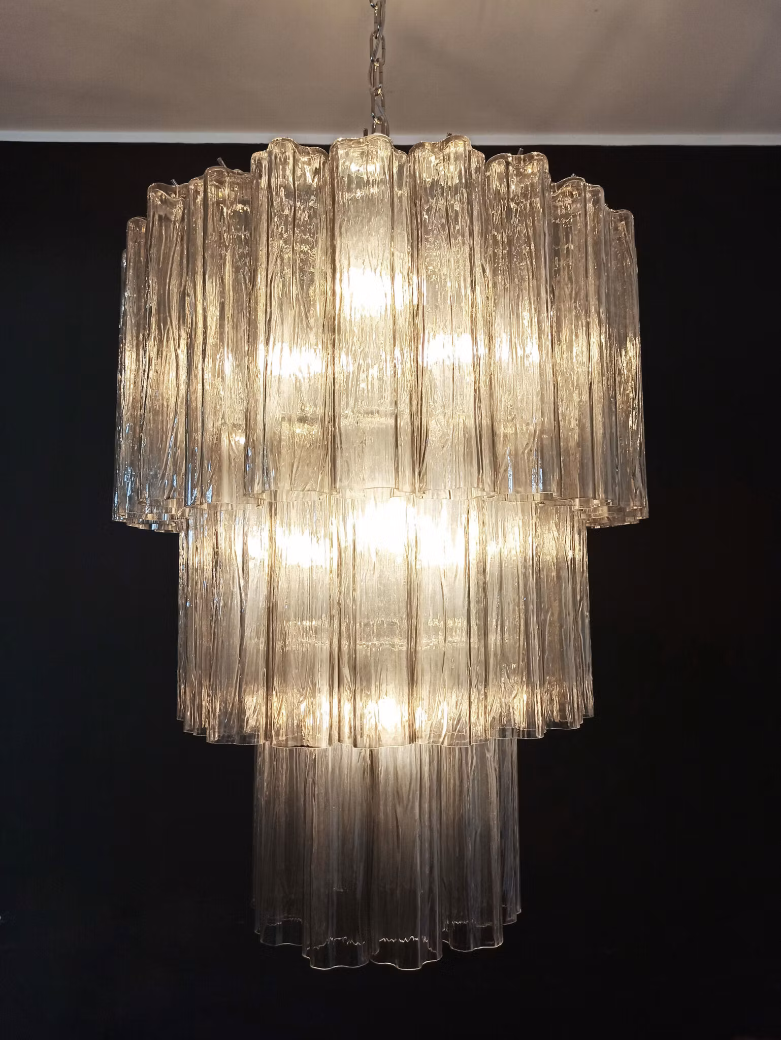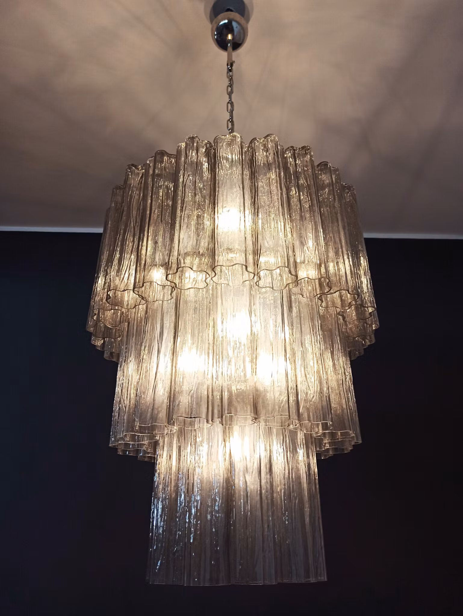 Majestätisk Italiensk ljuskrona i Muranoglas och förnicklad metallstruktur. Ljuskronan består av 52 stora rökig glasrör i stjärnform.