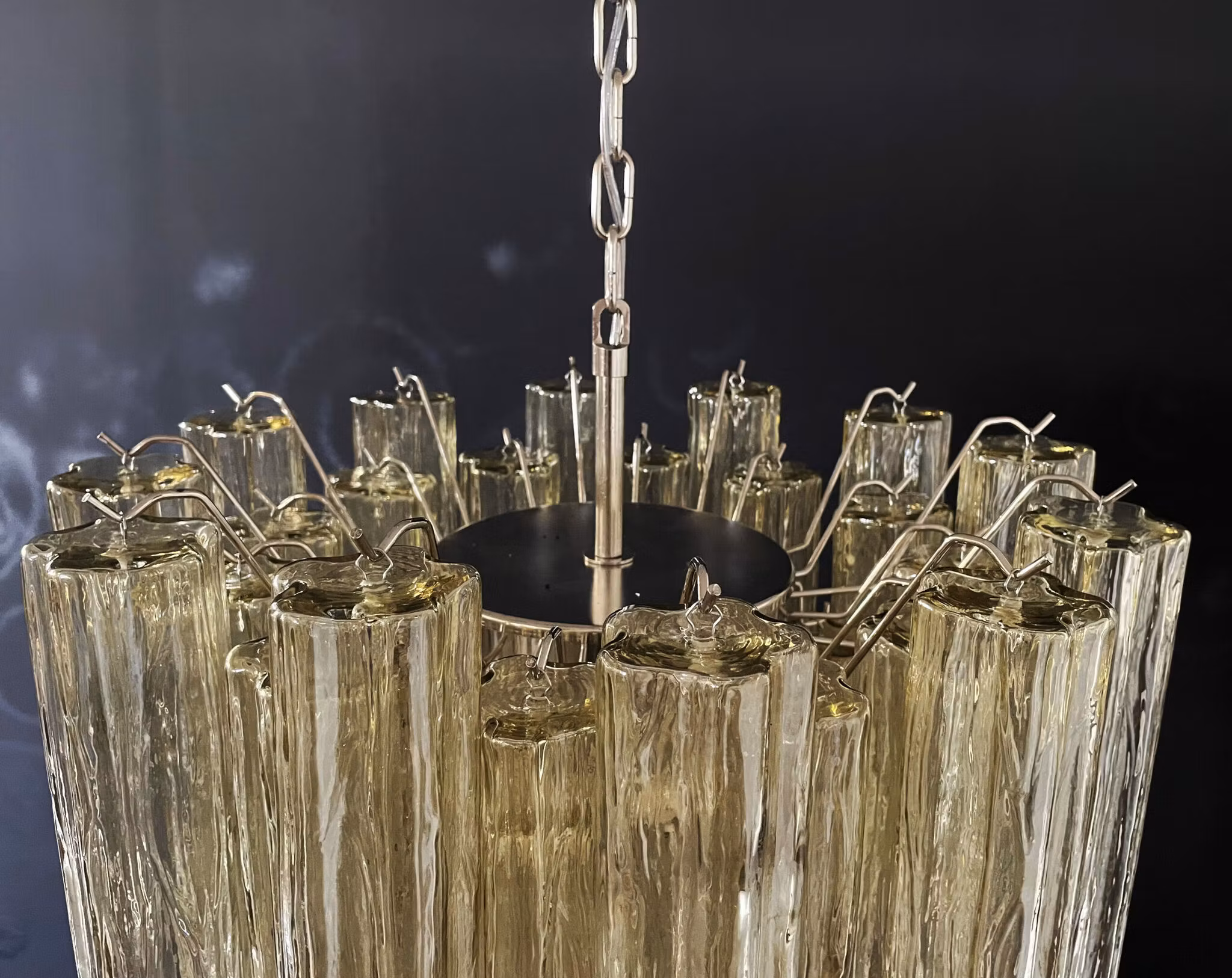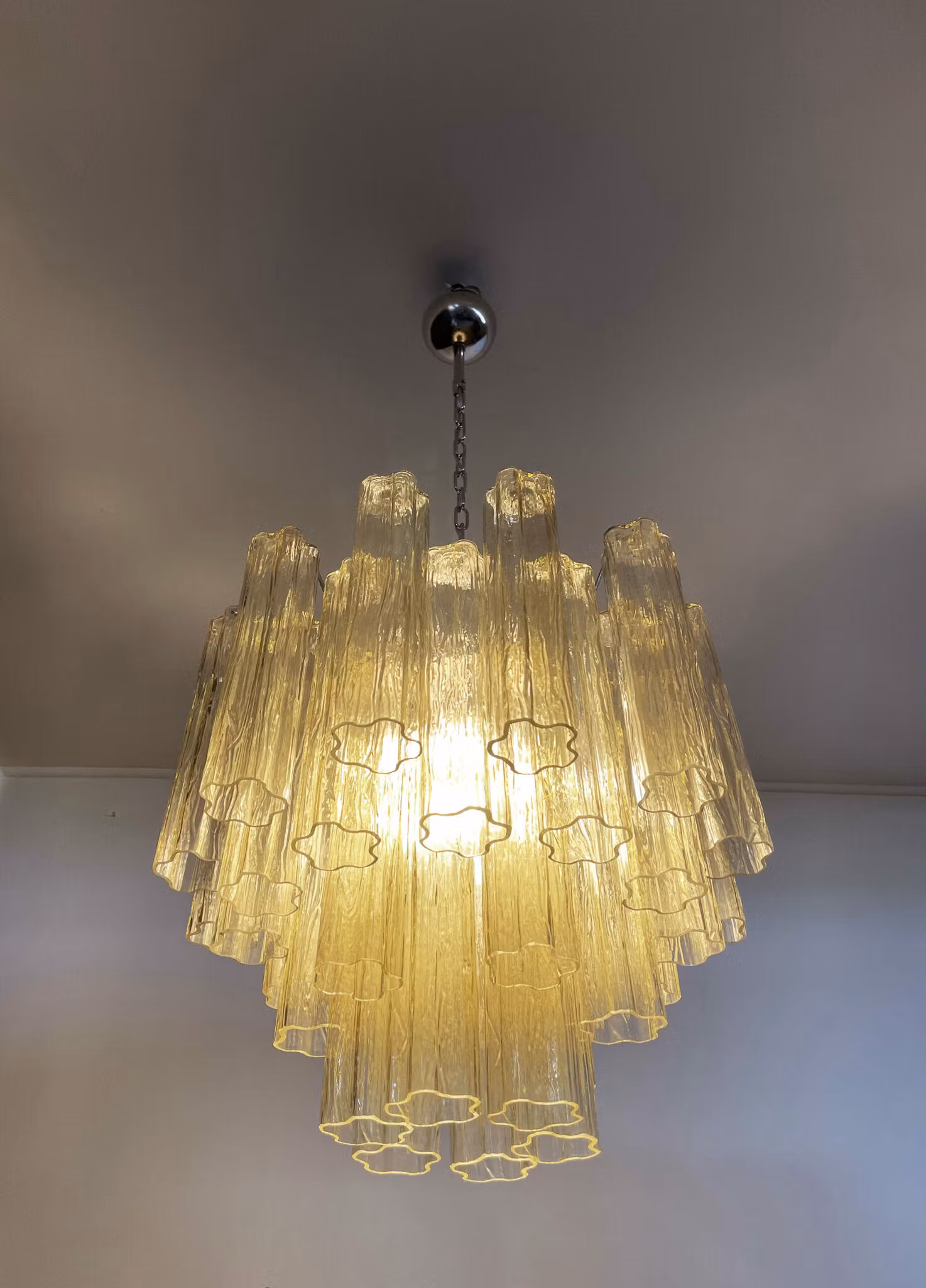 Italiensk ljuskrona gjord av 36 vackra Bärnsten/ gul färgade Murano med stjärnform. Helt otroligt vacker ljuskrona.