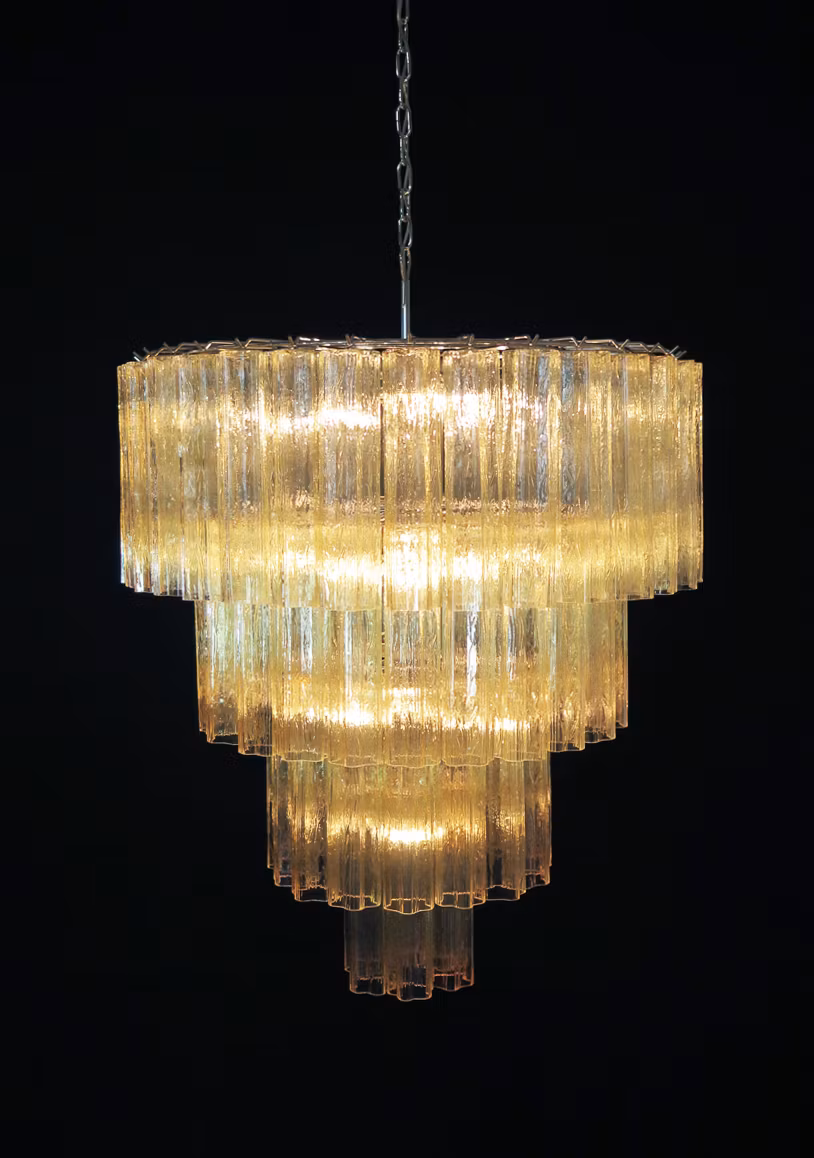 Italiensk ljuskrona i Murano glas, fyra våningar med 78 stora Abaster bärnsten färg glasrör i stjärnform.