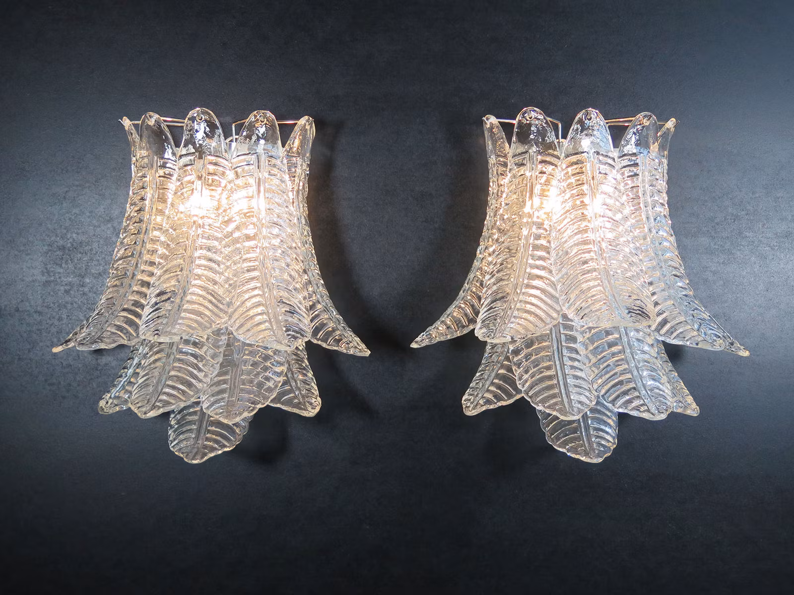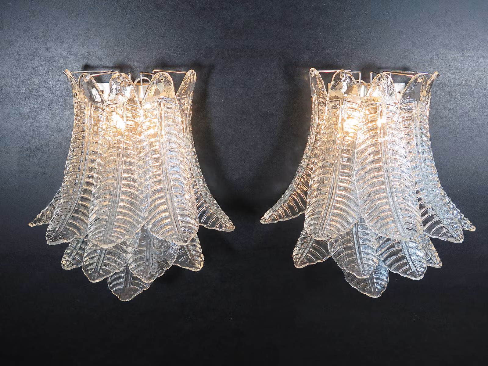 Ett par Six-Tier Felci Vägglampor med 10 st glas blad i varje. Lampan är väldigt elegant och snygg och ge ett behagligt ljus.